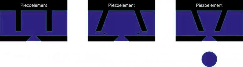 Für die Drucktechnologie wird zum einen der sogenannte Bend-Mode genutzt. Hier bildet die Keramik die Rückwand oder Decke der Düsenkammer. Man legt eine Spannung an die Piezokeramik, welche sich in Folge biegt und das Volumen der Farbkammer verändert. Der Tropfen wird geformt und mit dem Entspannen der Piezokeramik neue Tinte in die Kammer gesaugt. Beim Shear-Mode wird die Piezokeramik anders angesteuert, sodass die Kristalle eine Schwerkraft erzeugen. Durch die Kristalle, die an der Oberseite der Düsenkammer fixiert sind, kommt es so zu trapezförmigen Verformungen. Diese erzeugen so den nötigen Druck, um einen Tropfen zu formen.